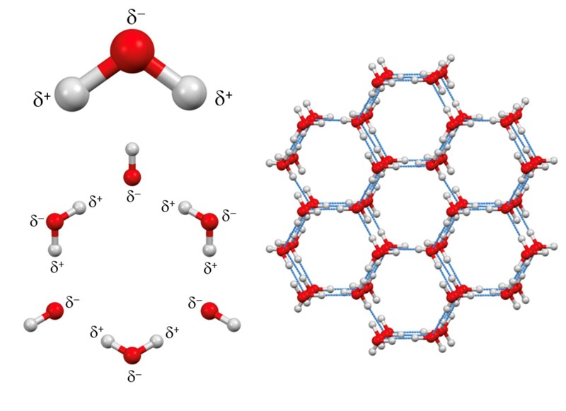 När temperaturen kommer ner under 0°C bildas is, och då rör sig inte molekylerna fritt utan ordnar sig i en hexagonal symmetri med fyra stabila vätebindningar. Dessutom är vattenmolekylernas vätebindningar i kristallformen aningen längre (närmare 4Å) än i flytande form. Detta tillsammans för att is får lägre densitet och flyter i vatten.