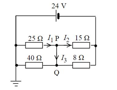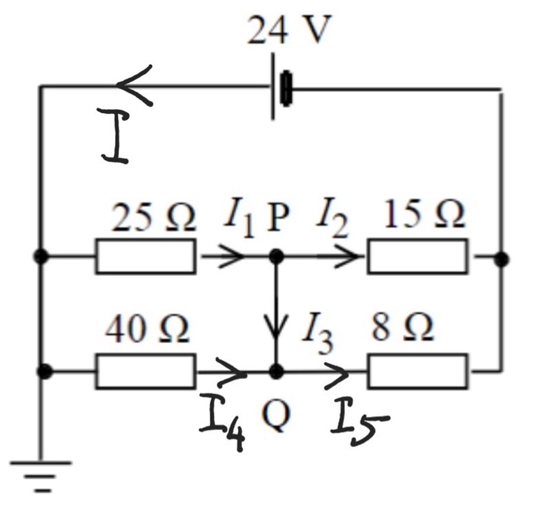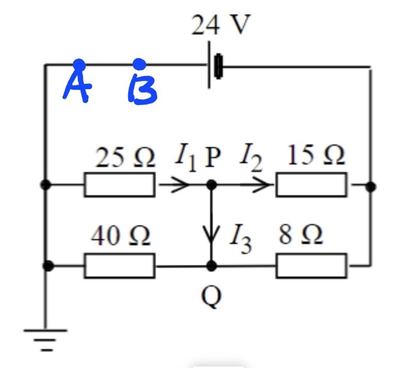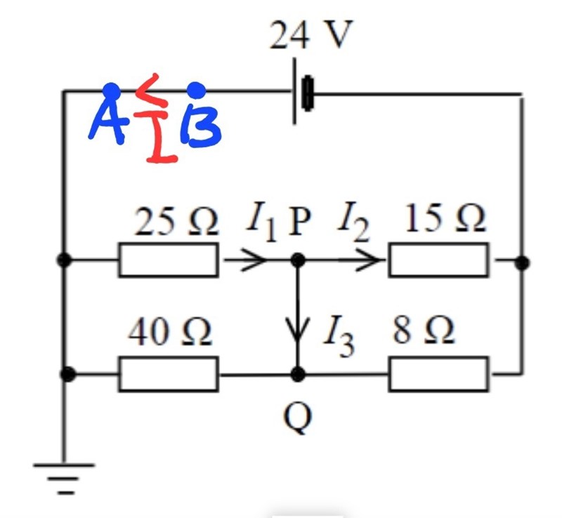 Ja, men strömmen flyter från B till A eftersom den rör sig mot minuspolen på batteriet. Men I P och Q rör sig strömmen mot minuspolen oavsett om den vandrar upp eller ned i ledaren. I P kommer strömmen dela upp sig i två delar. Därför borde den väl dela upp sig i Q också? En ström mot 8 ohms-resistorn samt en ström uppåt mot 15 ohms-resistorn.