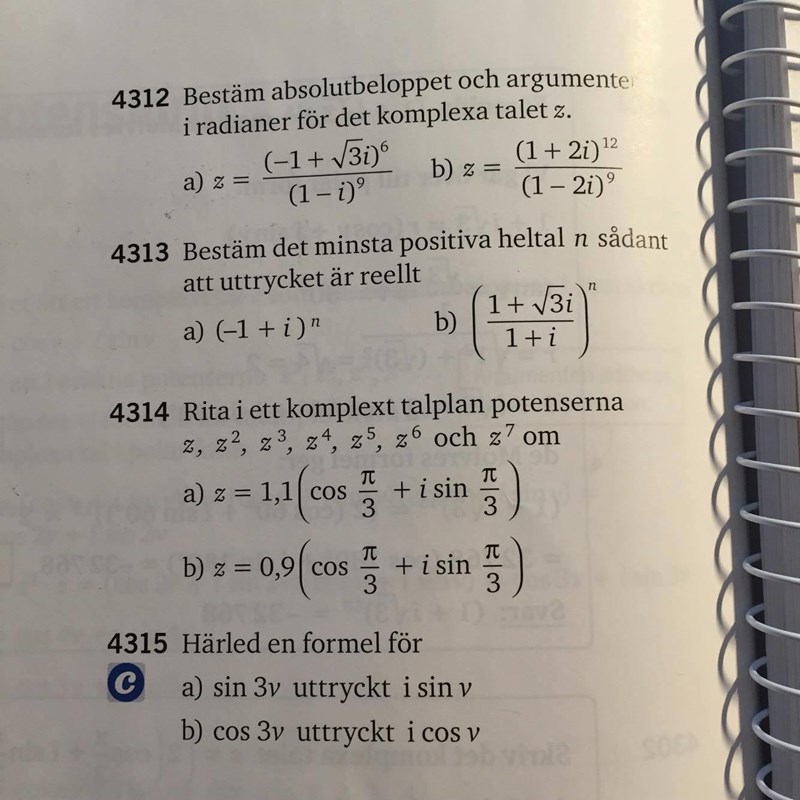 uppgift 4315.. kan inte få till det, vet att det ska ha något med moivres formel att göra. Hur skriver jag om det som ett komplext tal och sedan finner något uttryck där 3v = v eller något...