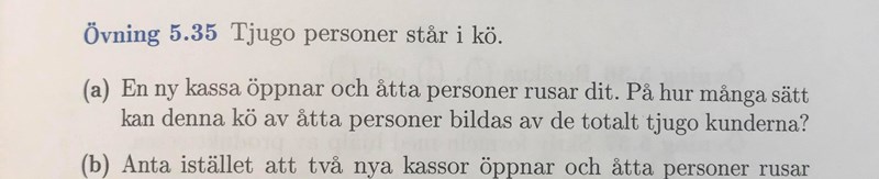 Det är 8 personer som går till den nya kassan i båda fallen, varför är det då 8! sätt på den ena och 20! / 12! i det andra fallet? Det är väl fortfarande lika många personer som springer till den nya kassan oavsett hur många det var från början i ursprungliga kön? Vad hade hänt om det stod att "20 personer" istället för "fullt av folk" i första uppgiften?