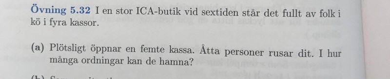 Laguna skrev:Det är samma skeende som beskrivs, men olika frågor. I första fallet bestämmer sig åtta personer för att byta kassa och går till den nya kassan. Vid den nya kassan står nu åtta personer. Nu kommer vi och undrar på hur många sätt dessa åtta kan vara ordnade. Vilka de åtta är är redan givet.
