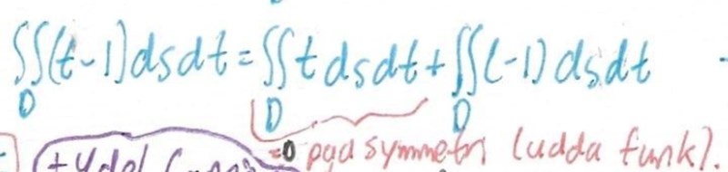 Bilden ovan kommer ifrån ett lösningsförslag. Dubbelintegralen (t-1) delas upp i två enkelintegraler t och (-1). Jag förstår inte hur det går till?