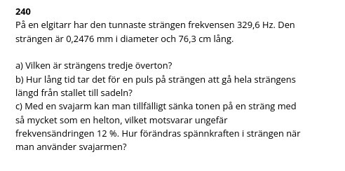 Hej, jag får fel när jag försöker räkna ut grundtonen genom att ta väglängden=2l=2x0,763 och sedan f=v/våglängden=340/väglängden. Då blir frekvensen runt 222 hz medan i uppgiften står det att grundtonen är 329,6hz. Så varför får jag inte rätt svar när jag räknar sådär? (Jag försökte räkna ut frekvensen för den tredje övertonen så vilket är anledningen till varför jag undrar detta).
