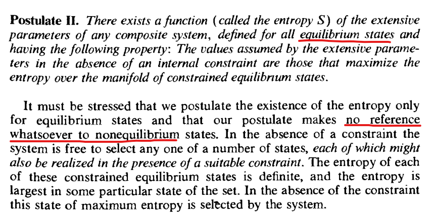 Här vet jag inte om jag håller med, men det kanske bara är ett missförstånd från min sida. Jag utgår från standardverket Callen's Thermodynamics and an Introduction to Thermostatistics, där han postulerar: [...]