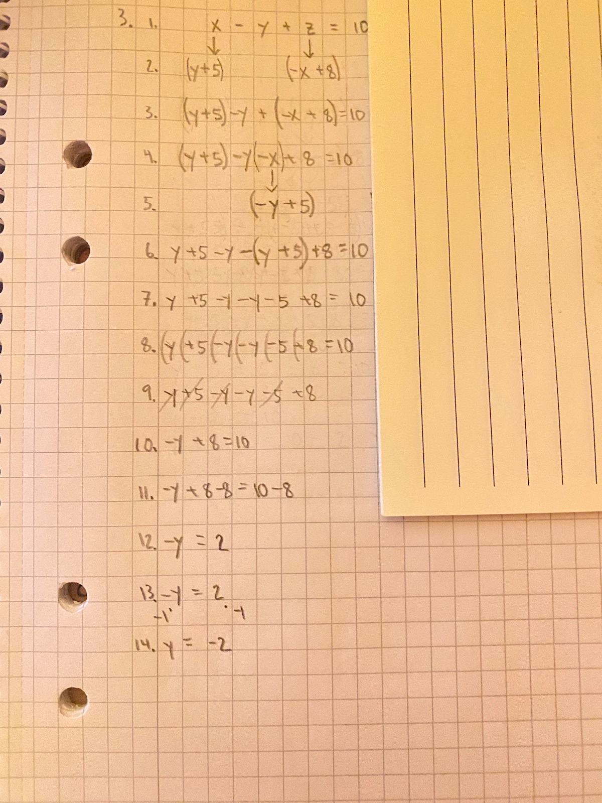 Blir det här tydligt? Där det står x sätter du in ditt uttryck för x, alltså (y+5), likadant som du gjorde i steg 2 och 3 med x och z. Sen blir det som vanligt att ett minustecken framför en parentes ändrar tecknen i parentesen.