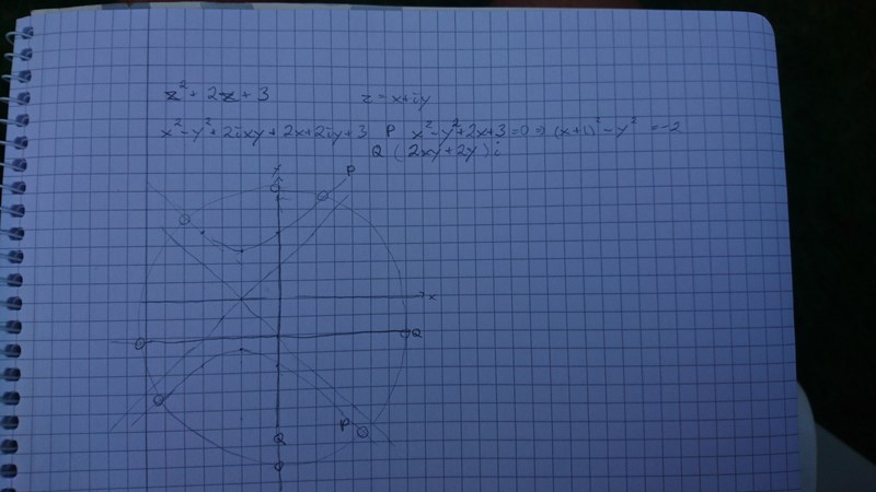 Jag provade med en andragradsekvation. Man ska välja cirkelns radie tillräckligt stor (som det står längre ner i texten) och då hamnar nollställena för mitt P på en hyperbel, och för Q på två linjer som skär varandra. Om man gör cirkeln tillräckligt stor så kan man betrakta bara termerna av grad m, och då kanske man kan fundera ut att vartannat nollställe hör till P och vartannat till Q, men jag ser det inte. Det borde vara så att eftersom Gauß använder det så bevisar han det först, men jag läste inte fortsättningen tillräckligt noga.