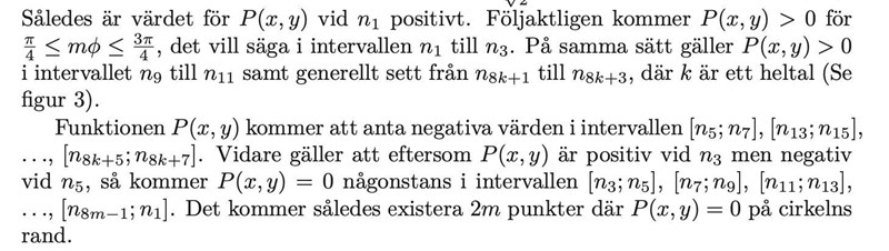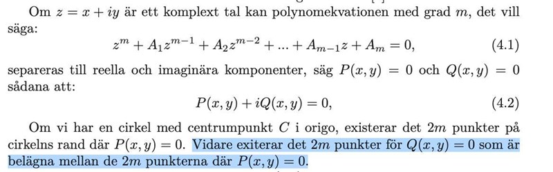 Laguna skrev:Jag provade med en andragradsekvation. Man ska välja cirkelns radie tillräckligt stor (som det står längre ner i texten) och då hamnar nollställena för mitt P på en hyperbel, och för Q på två linjer som skär varandra. Om man gör cirkeln tillräckligt stor så kan man betrakta bara termerna av grad m, och då kanske man kan fundera ut att vartannat nollställe hör till P och vartannat till Q, men jag ser det inte. Det borde vara så att eftersom Gauß använder det så bevisar han det först, men jag läste inte fortsättningen tillräckligt noga.