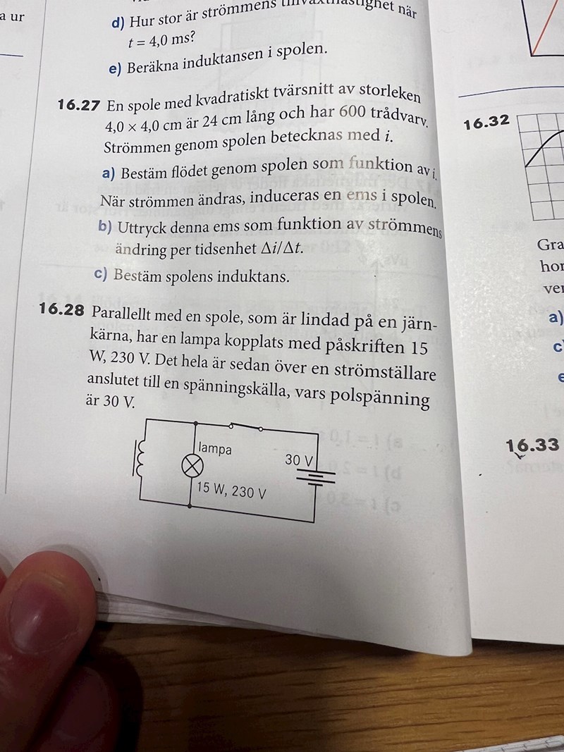 Jag får nog backa lite från det jag skrev. Uppgiften blir väldigt hypotetisk och motsägelsefull om man antar att spänningskällan är ideal. Symbolen betyder nog inte att den är det heller. Om spolen är en kortslutning så betyder det att det ligger 0V över lampan. Om spänningskällan är ideal så ligger det 30V över lampan. Motsägelse.