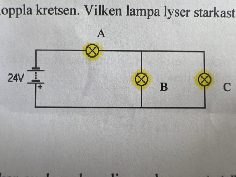 Min uppfattning här är att lampa A är seriekopplad medan B och C är parallellkopplade. Lampa A ska lysa starkast, men varför? Har det att göra med att elektronerna rör sig från - till + och då strömmar genom A först?