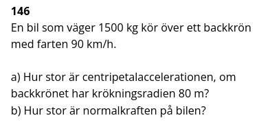 Tänk dig att kraften som bilen lättar med är lika stor som kraften för att behålla bilen runt krönet, dvs centripetalkraften. Dessa uppgifter är bättre att fundera på än att följa formler.
