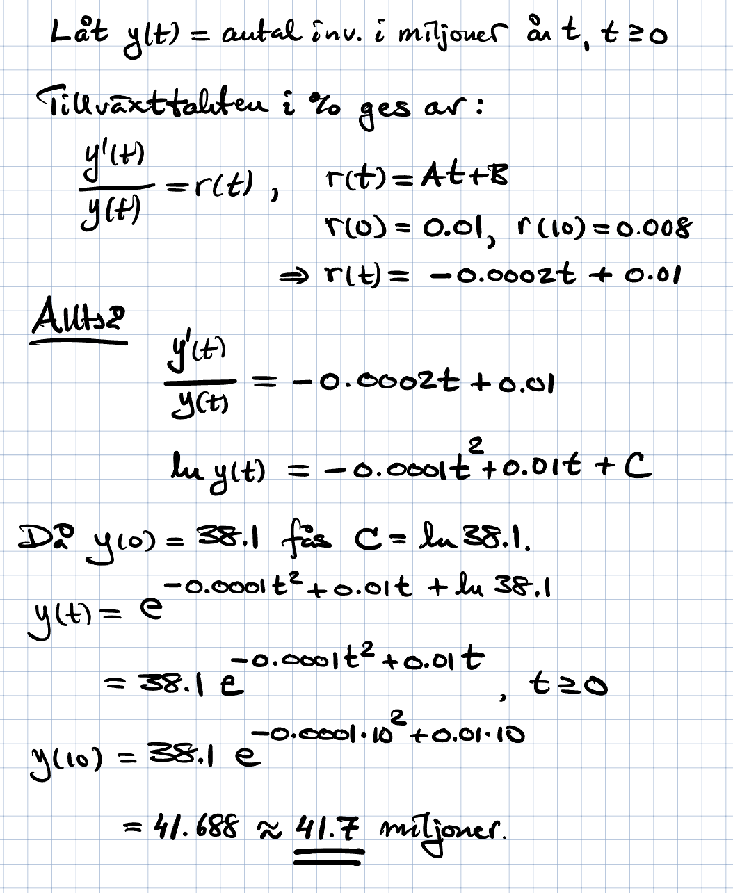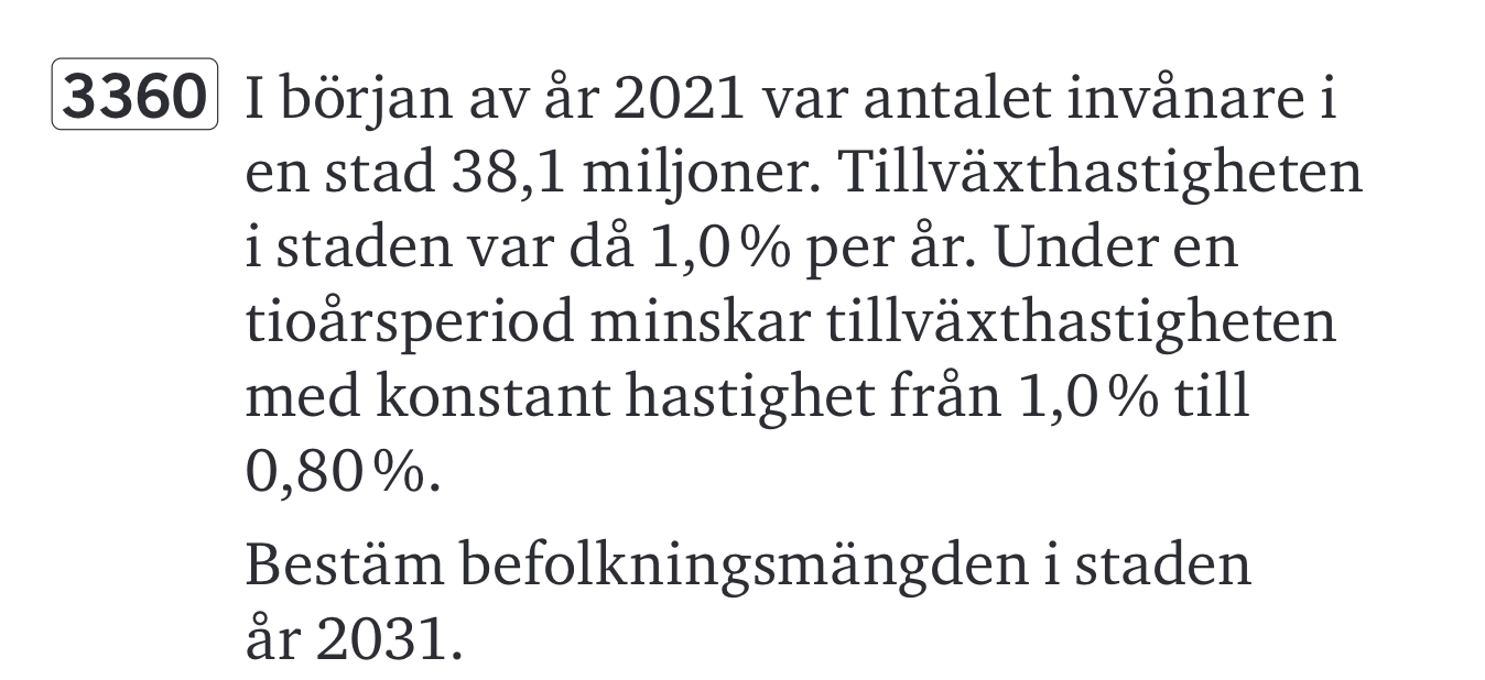 Alltså att förändringen är proportionell mot den nuvarande befolkningen? Det står ju inte uttryckligen i uppgiften att förändringen beror på den aktuella befolkningen, utan bara att tillväxthastigheten är 1 % per år och att den sedan minskar linjärt över tid.