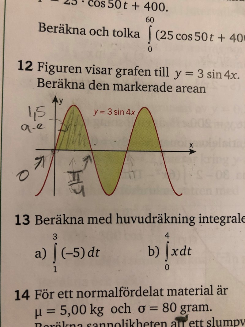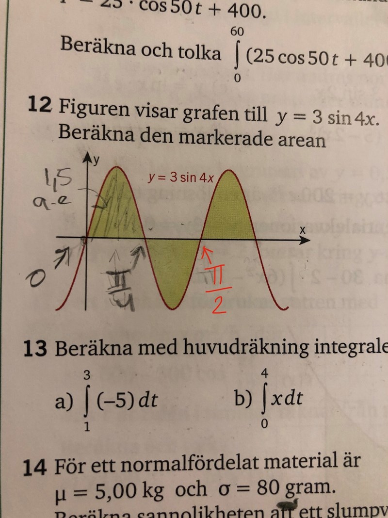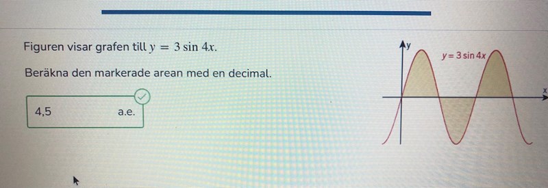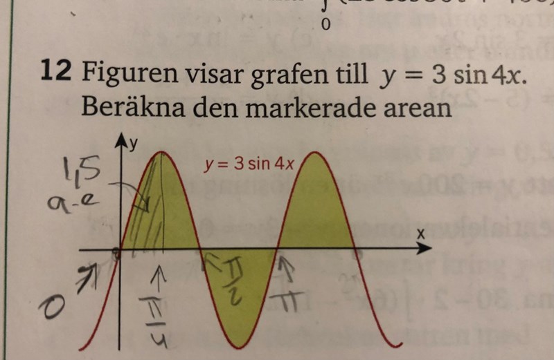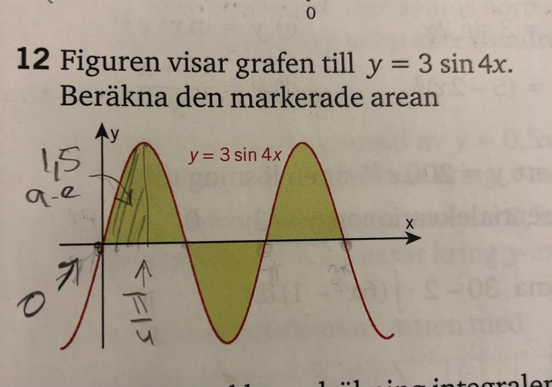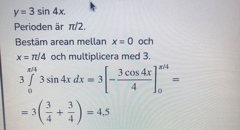 Men borde det inte väl räcka att man tagit fram nollställen, dvs integrationsgränserna för funktionen för att ta reda på arean av funktionen? Istället för att multiplicera med 3.