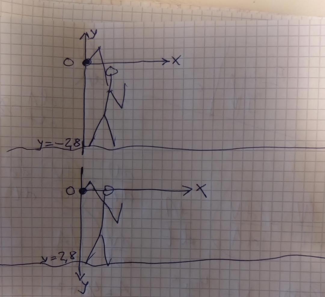 Om boken definierar en y-axel som har nollnivå där bollen lämnar kalles hand, och positiv riktning definieras som uppåt, så kommer marknivån att ligga på y=-2.8.