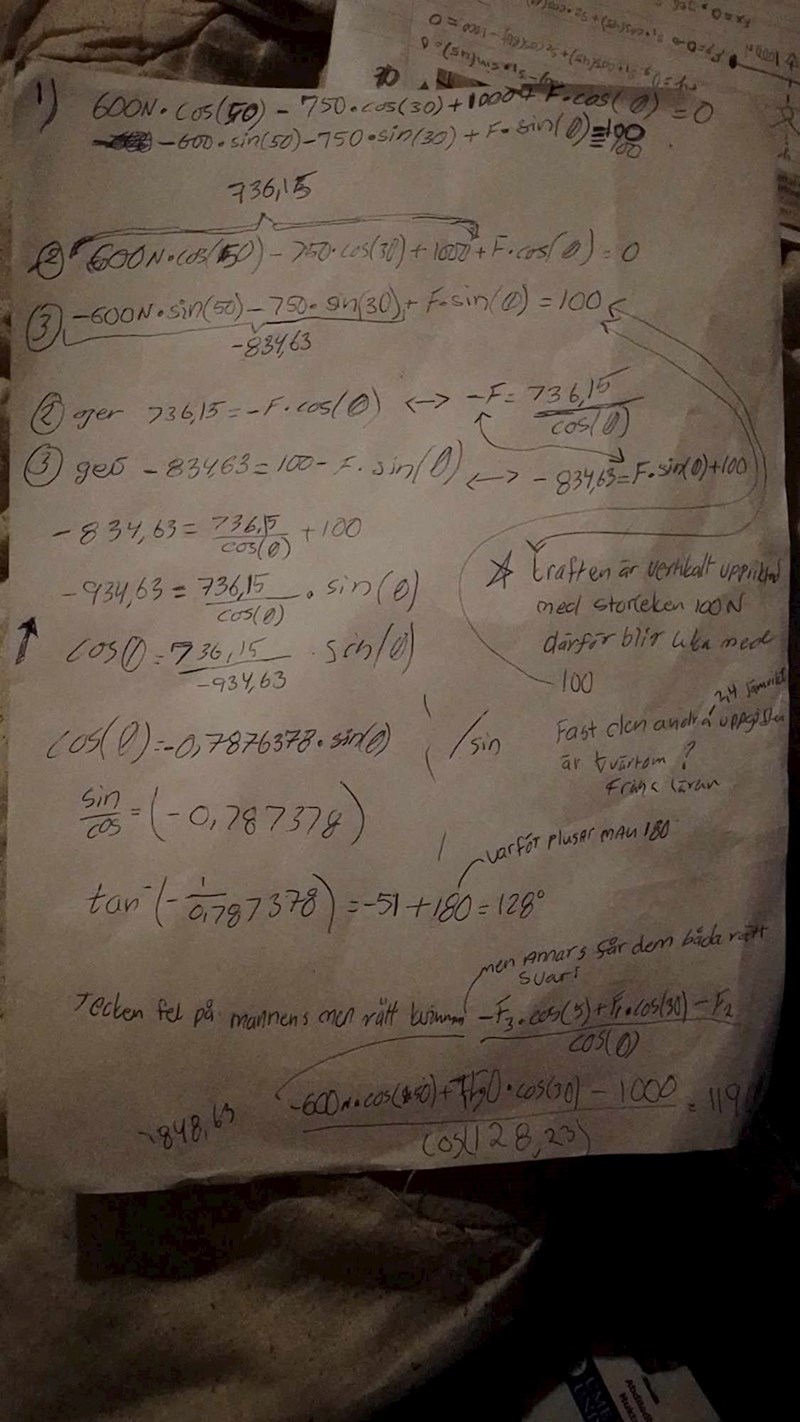 ja vissa ställen -f till +f men de påverkar inte till att komma till rätt lösning för de är ju bokstav inte siffror.Men jag kom till rätt svar altså 128 grader som facit stod.Men min fråga till dig är varför plussar man 180 grader? kan du ge någon bild?