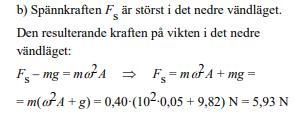 Varför räknar de med tyngdkraften? Jag känner till formeln , men varför har de räknat med tyngdkraften också? Man kan komma fram till, som jag tror jag lyckades med i denna tråd, att kraftsumman i det nedre läget bara består av fjäderkraften och är oberoende av tyngdkraften. Men tydligen är det fel här? Fattar nada.