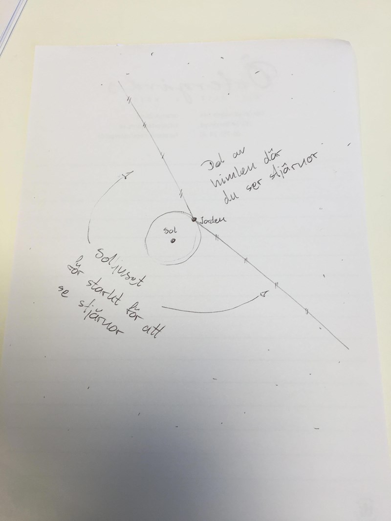 Rita en figur där du har solen i mitten, jorden på en cirkelbana runt solen, och stjärnorna långt från solen (och jorden) så kanske det blir enklare att förstå.