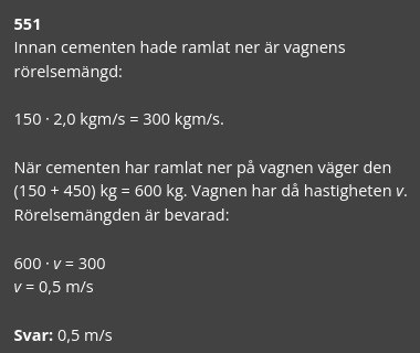 Smaragdalena skrev:Hejsan266 skrev:Hej, varför ska jag använda formeln för rörelsemängd bevaras i denna uppgift? Själv använde jag formeln för en oelastisk stöt men det är tydligen fel. Jag tänkte i alla fall för att betongen ramlar i vagnen blir det som att föremålen sitter fast i varandra. Sedan kan jag ha tänkt så p.g.a. att uppgiften ligger i kapitlet om stötar.
