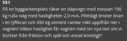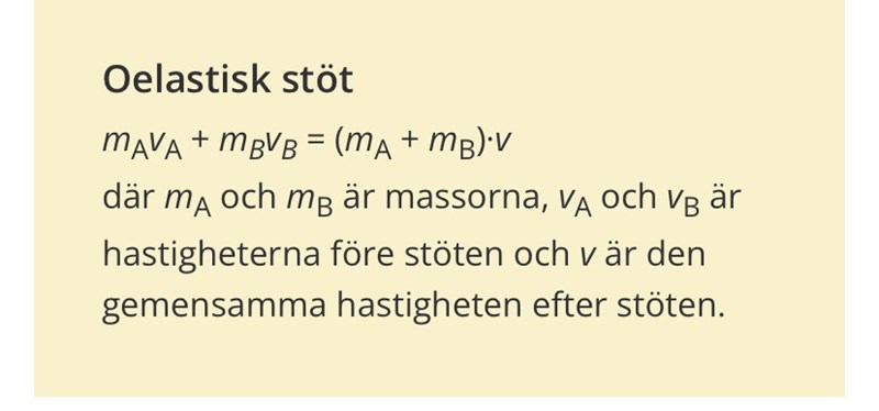Hejsan266 skrev:Hej, varför ska jag använda formeln för rörelsemängd bevaras i denna uppgift? Själv använde jag formeln för en oelastisk stöt men det är tydligen fel. Jag tänkte i alla fall för att betongen ramlar i vagnen blir det som att föremålen sitter fast i varandra. Sedan kan jag ha tänkt så p.g.a. att uppgiften ligger i kapitlet om stötar.
