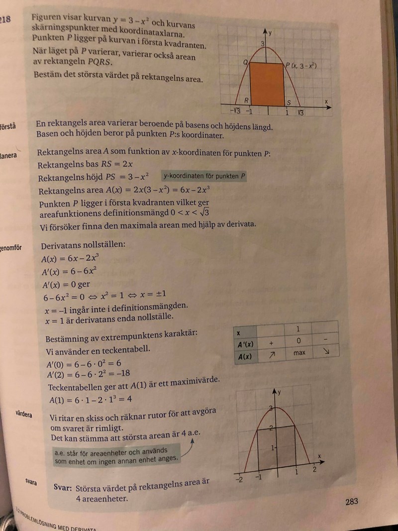 Skaft skrev:En derivata kan ju vara noll utan att det rör sig om en maxpunkt. Så när man löst ekvationen A'=0, hittar man kandidater till en maxpunkt. Lutningen är ju noll även i minpunkter och terrasspunkter. Därför undersöker man hur lutningen ser ut omkring kandidatpunkten, för att säkerställa att det faktiskt är ett maximum.