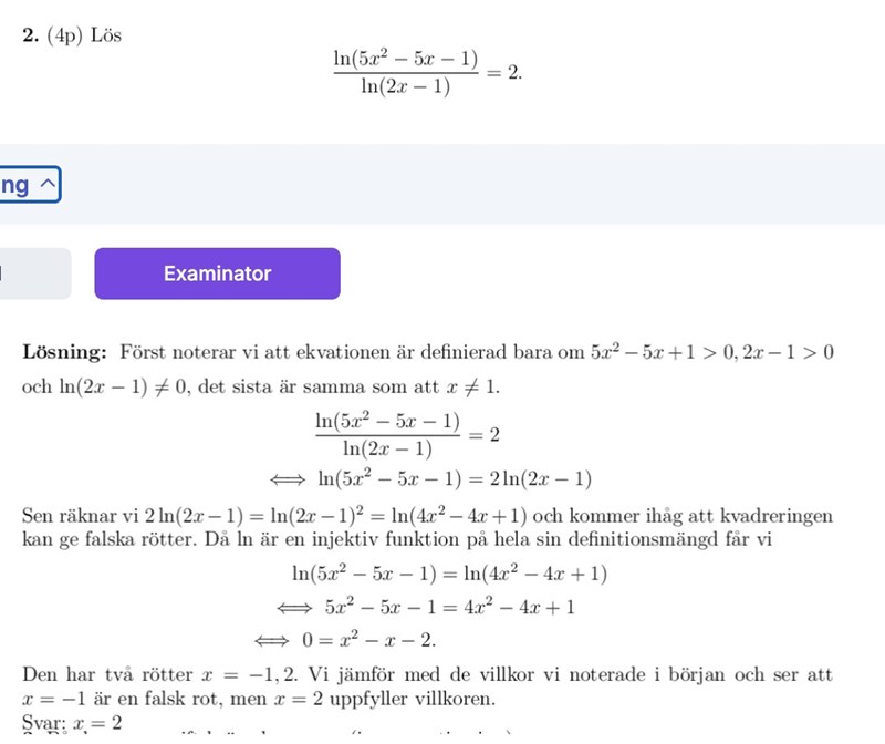 Jag har för mig att en funktion är injektiv om den är strängt växande eller strängt avtangade i ett intervall, vilket ln(x) uppfyller. Dock förstår jag inte vad det har för relevans i uppgiften. Alltså fattar jag inte hur det kommer sig att eftersom ln(x) är injektiv leder till att man kan ta bort ln uttrycken.