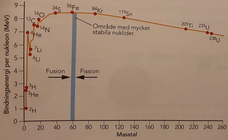 Hej! Bilden nedan kan jag tolka. Men jag förstår inte varför det gäller att just masstalen ≈ 60 har stabila nuklider. Går detta att förklara med den starka kraften kontra elektromagnetiska kraften? Att dessa två krafter påverkar storleken på bindningsenergin? Men i så fall, hur kan man bäst förklara detta?