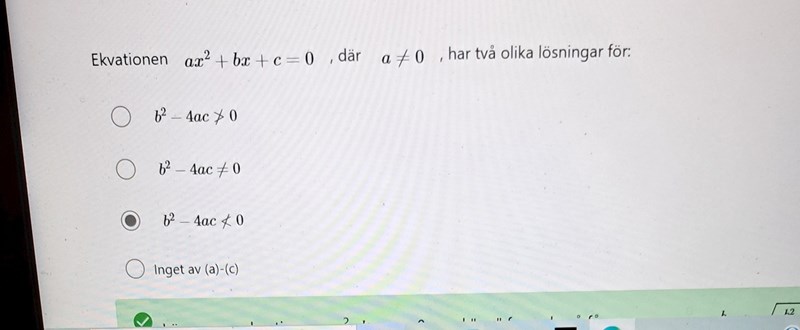 Aa asså jag är ej helt med på din förklaring ,men jag tänker de andra är felaktiga för de tar ej med att b^2-4ac<0 eller b^2-4ac>0 som mitten alternativet gör. Ena säger den får ej vara det fast det får vara >0 och tredje säger den får ej vara mindre än 0 fastän mitten alternativet säger den får vara det så länge det ej blir dubbelrot. Det gör dem andra till falska alternativ.