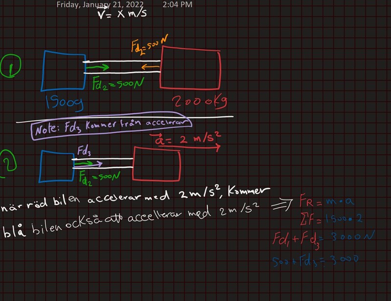 - Jag tankar att den bil (1) drar bil (2) med Fd1 = 500 N mot bil 1.