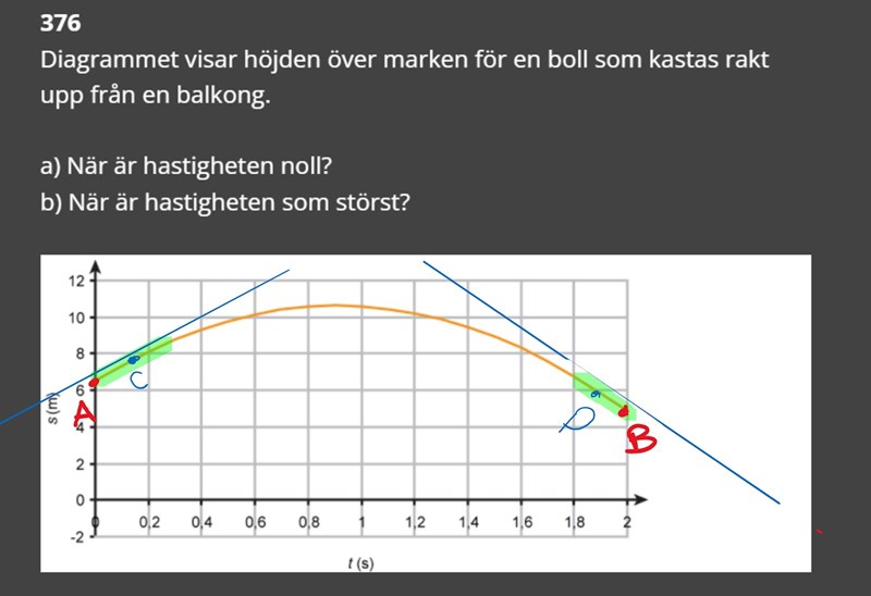 i den här fråga i b) de vill att säger när hastight som storst. och boken facit säger att A och B är svär men