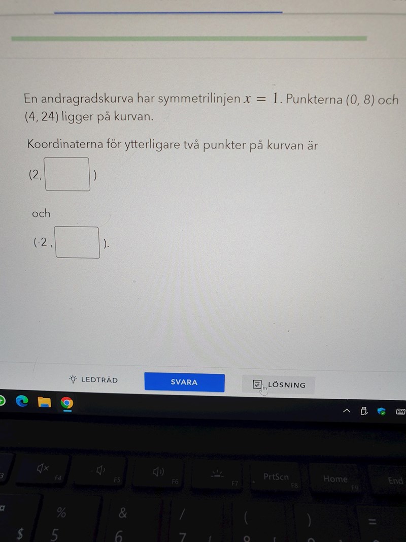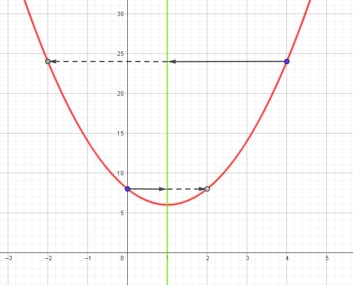 I frågan står ingenting om spegling. Om man kommer på själv att x-koordinaterna för de efterfrågade punkterna är speglingarna i symmetrilinjen av de givna punkterna så kan man lösa uppgiften.