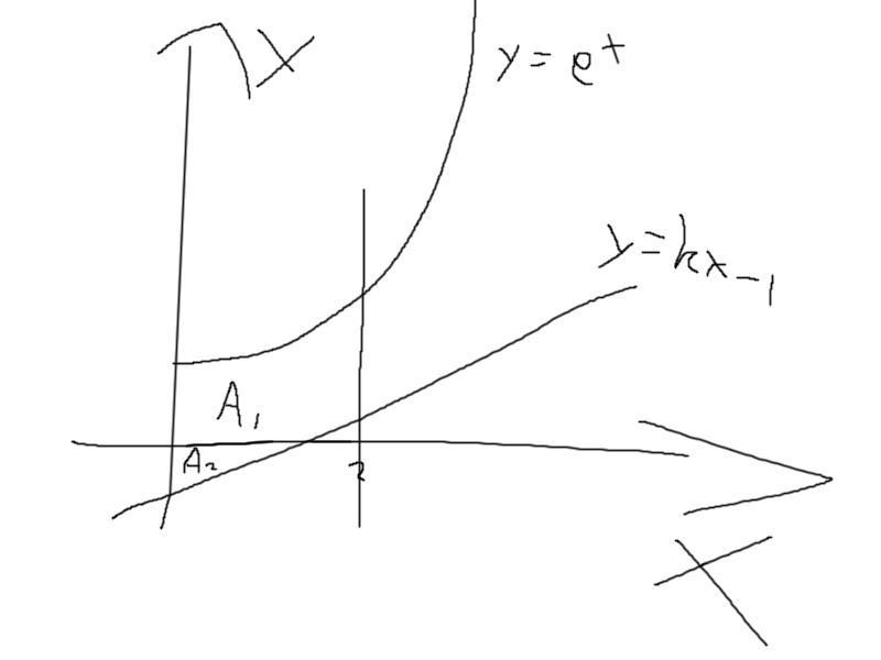 "Graferna till funktionerna y=exoch y=kx-1 samt linjen x=2 bildar tillsamm ans med y-axeln ett slutet område. Beräkna riktningskoefficienten k för linjen y=kx-1 så att områdets area blir areaenheter."