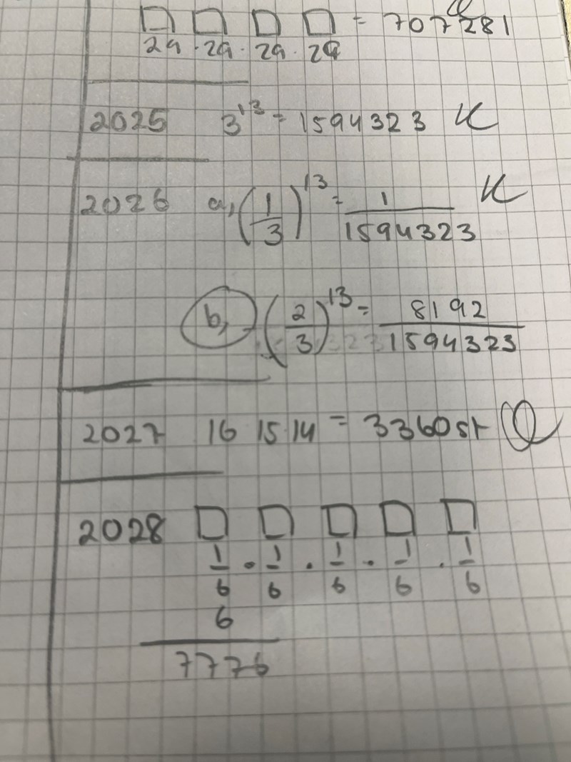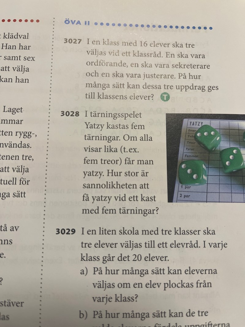 Hej, facit har de skrivit (1/6)^4 vilket jag inte förstår mig på. Det finns 5 tärningar så borde det inte då vara 5? Om jag förkortar mitt svar med 6 får ju jag samma som facit men vart kommer 4 från??? 2028