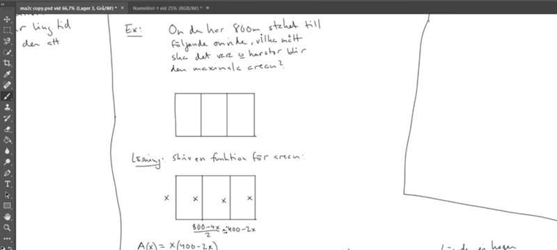 Därmed har man x meter staket för att bygga varje yttre kortsida, och (800-4x)/2 för att bygga varje långsida.