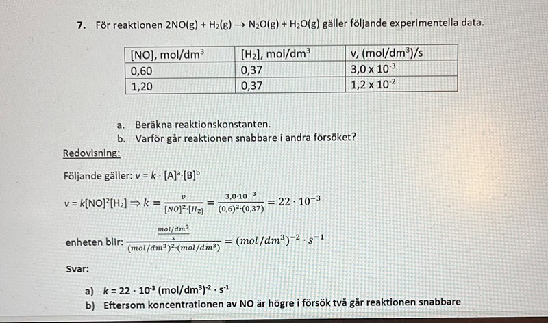 Jag undrar varför man i facit har tagit koncentrationen av NO upphöjt till 2 (0,6)2? Borde det inte bara vara 0,6 x 0,37 i nämnaren? Jag uppskattar om någon kunde förklara för mig varför man gör på detta vis som det står i facit! Skulle också uppskatta vad a och b står för i denna formel: v = K[A]a[B]b.