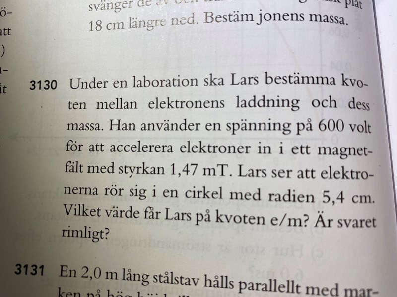 I facit står att man ska använda formeln QvB = (mv^2)/r, vilket jag har full förståelse för - när elektronen når det magnetiska fältet uppstår en magnetisk kraft som är = en centripetalkraft.