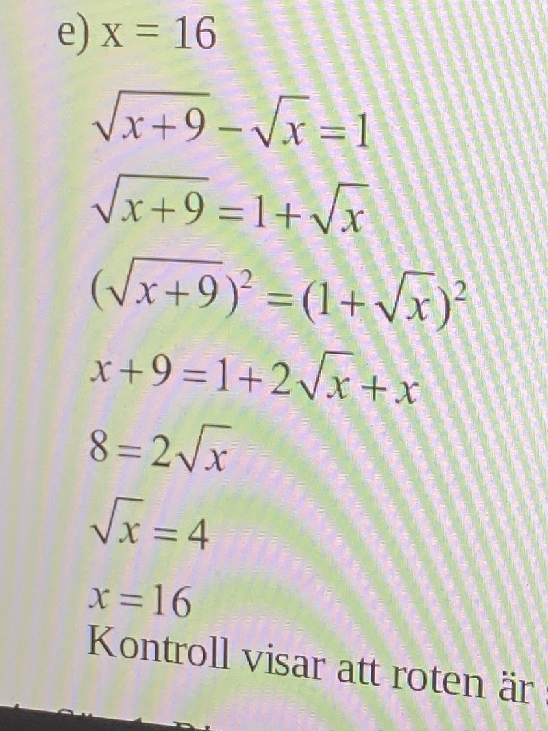 Roten försvinner av kvadraten, 9=3\sqrt{9}=3, (3)2=3(\sqrt{3})^2=3 därför att (3)(3)=3(\sqrt{3})(\sqrt{3})=3