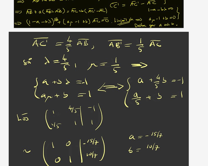 Sedan gör man operationer på den matrisen för att lösa ekvationssystemet. Där har de gått fort fram och bara skrivit lösningen, men du kan väl lösa ett sådant ekvationssystem? Multiplicera första raden med 1/5, subtrahera från andra raden, etc.