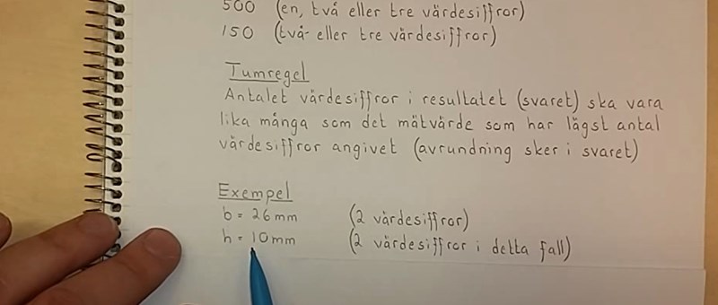 Om du i samma uppgift får både "b=26 mm" och "h=10 mm" är det mest rimliga att tolka det som att 10 har 2 gällande siffror. Detta eftersom det är två mått och mätningen av höjden kan antas ha gjorts med samma noggrannhet som bredden. Är uppgiften oklar bör man motivera sin tolkning.