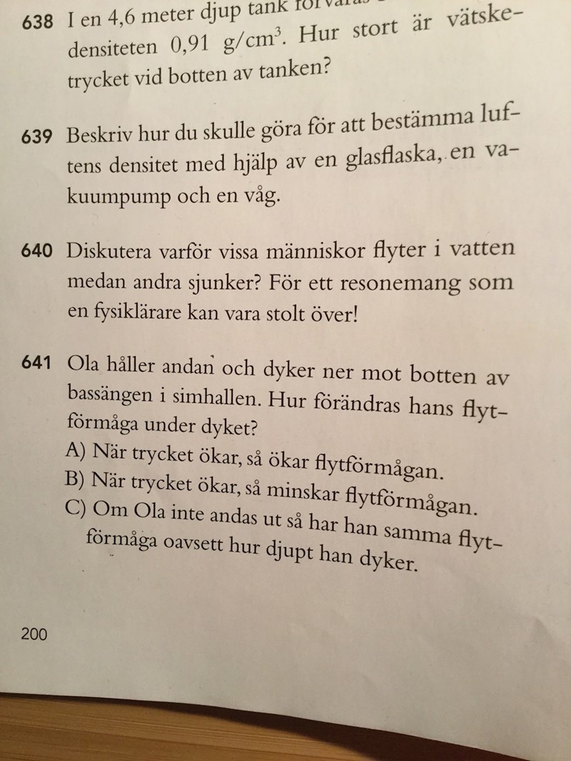 Fråga 640. Hur har densiteten med det här att göra? På facit står det att det beror på densiteten. Det enda jag kan komma fram till är att lyftkraften och tyngdkraften ska vara lika stora.
