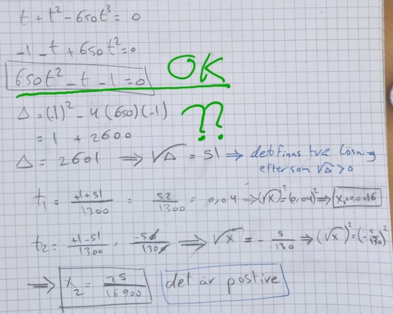 Faktumet att den är positiv bevisar att det finns två lösningar för .