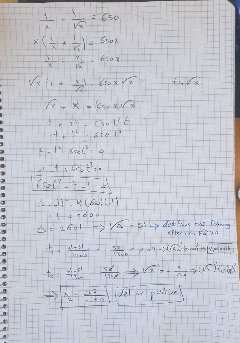 Yngve skrev:Det stämmer att ekvationen har två lösningar, nämligen och .