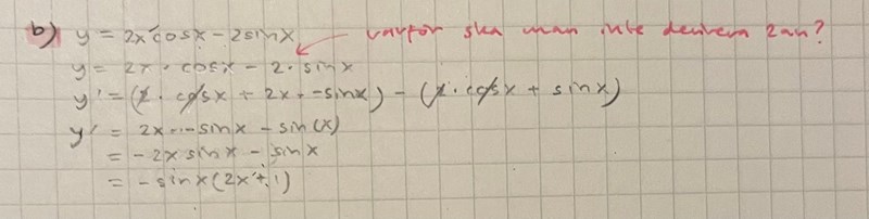 Jag håller på med denna uppgift som du kan se nedan. Jag har försökt lösa den mha produktregeln. Jag undrar varför 2an inte ska deriveras (se bilden nedan)? Tack på förhand!