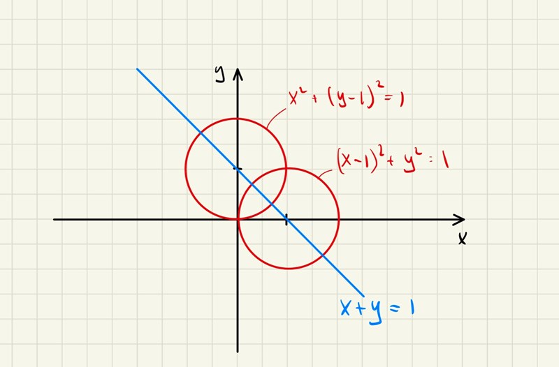Nej, det stämmer inte. Vi har J(x, y) = 1-x-y. Var i xy-planet är J(x, y) < 0. Jag har visat med den blå linjen var J(x, y) = 0. 1-x-y = 0 x+y = 1.