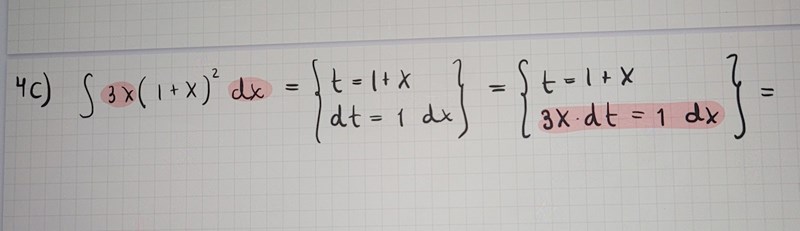 Så jag ska göra ett variabelbyte så jag har valt mitt t, men när jag sedan vill få ut dt så blir det bara 1. Man brukar ju göra så att det som är rosa ska vara likamed dt. 1 är ju knappast likamed 3x. Hur kan man skriva om dt så det passar?