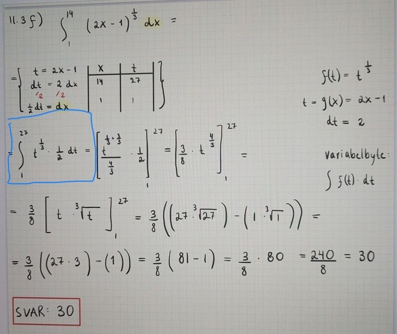 När du 8ntegrerar skall du ju få fram värde, här har du ju bytt till t i gränser och integrand(blått). Finns ingen anledning att byta tillbaka.