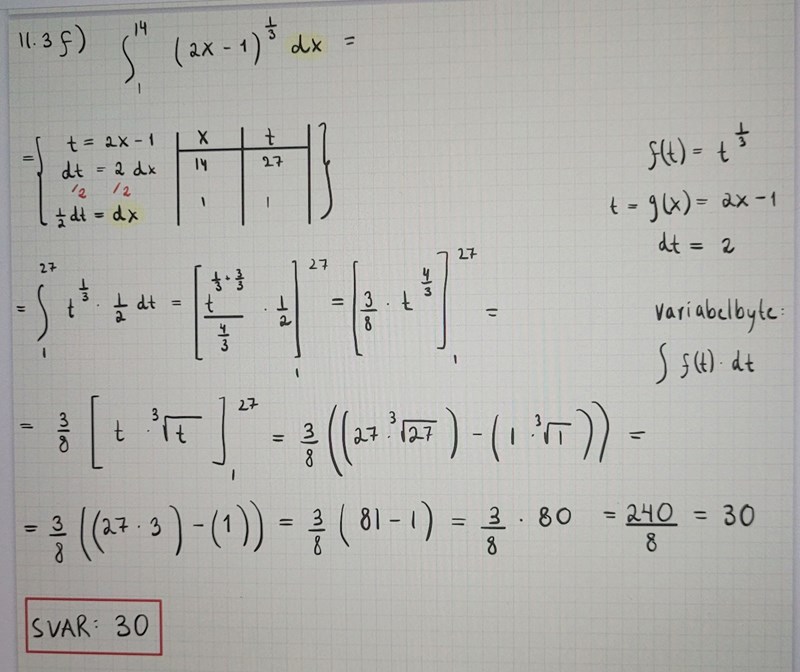 När man tar fram variabelbytet för en primitiv funktion så sker det på slutet (dvs ersätter alla t) men för en integral är det alltid så att själva integralsgränserna som indikerar att man gjort själv bytet?