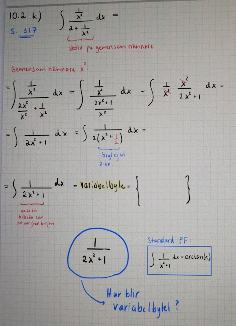 Om du däremot ersätter x med t enligt sambandet jag föreslog så kommer du få nämnaren på din bild. dvs.