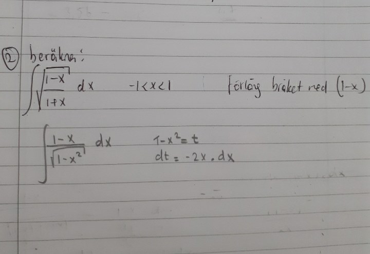 Tack så mycket. Har löst det genom arcsinx ( vet inte om du menade denna väg, men när du sa sinx har jag sett derivatan av arcsinx efter förlängning med bråket. Sedan löste jag uppgiften (den andre termen) med hjälp av variabelsubstition . Svaret blev rätt enligt facit.