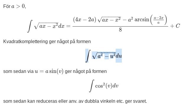 Dr. G skrev:Du bör nog kvadratkomplettera under roten. Sedan trigonometrisk substitution, tror jag.