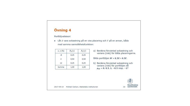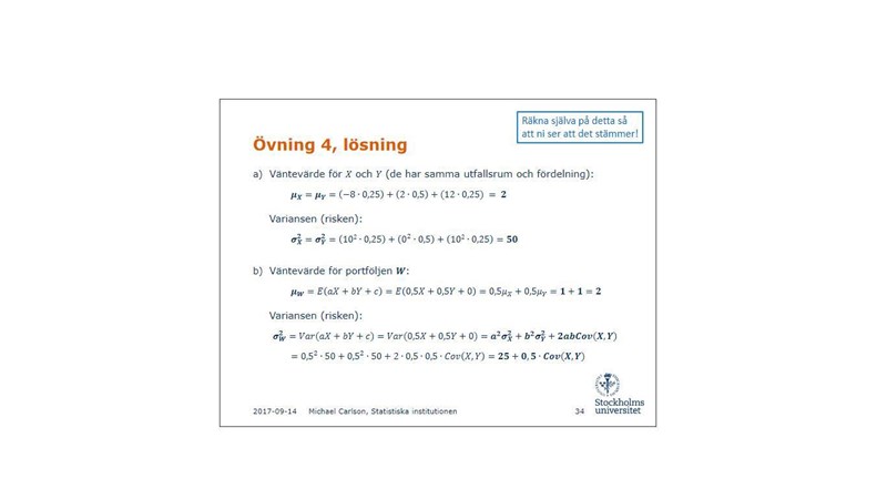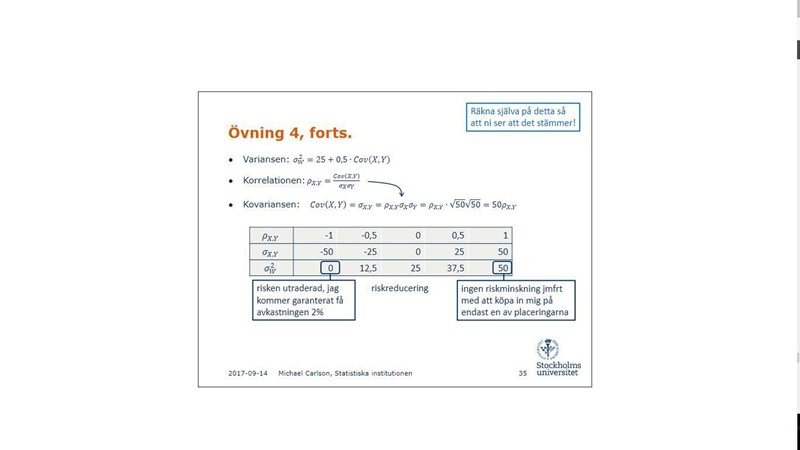 Jag får Cov(X,Y) till 1 dvs. 50/roten ur 50 * roten ur 50 = 1