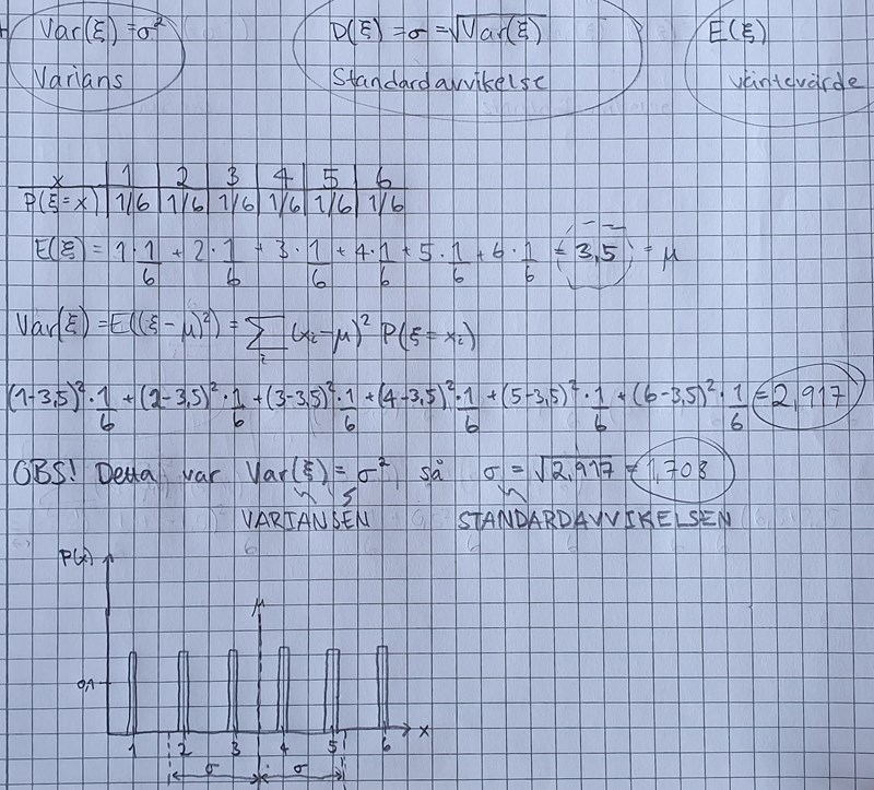 "Bestäm varians och standardavvikelse för ξ om ξ är likformigt fördelad på 1, 2,..., 6."